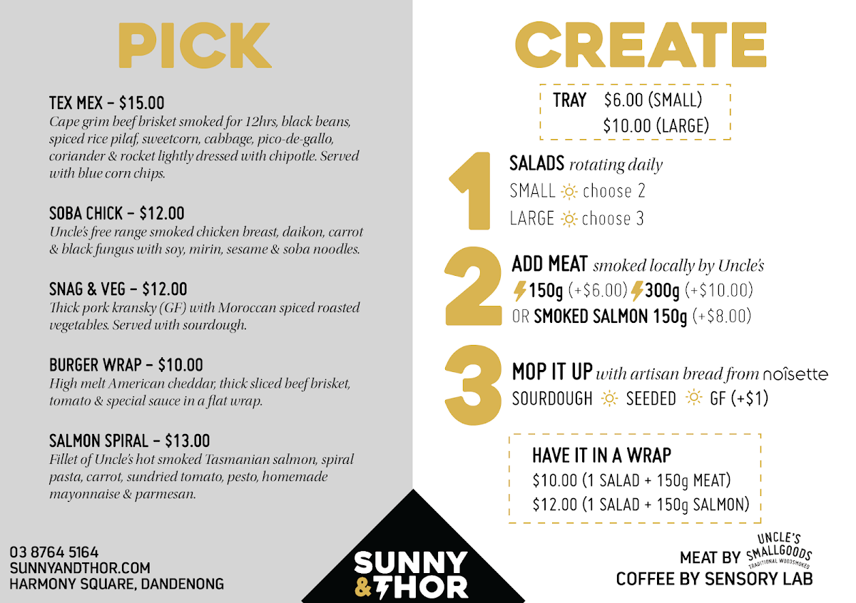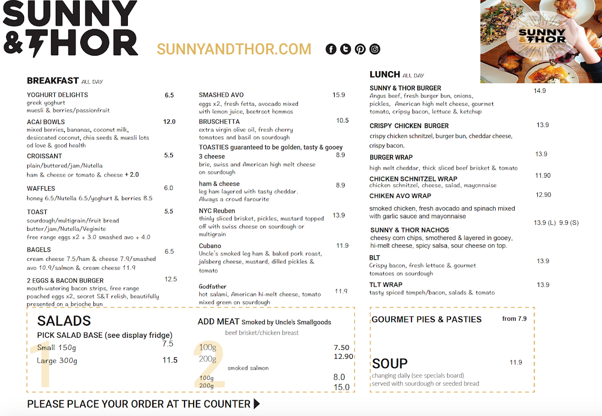 Sunny & Thor’s menu offers a well-rounded mix of café staples and catering-style bites, making it easy to find something satisfying whether you’re after a quick snack or a fuller meal. The drink selection ranges from refreshing options like Soft Drink (375 Ml) and Mt Franklin 250ml Sparkling to indulgent picks such as Boss Iced Coffee (237ml) and kombucha varieties. Light bites like Toasts and Croissant pair nicely with hot beverages like Coffee Single Espresso or Hot Chocolate By Sensory Blend. For something more substantial, the sandwich and roll lineup-featuring Chicken & Dill On Light Rye Sandwich, Meatball Focaccia, and Chicken Schnitzel Wholegrain Roll-offers hearty, flavorful choices. Sweet treats are a highlight, with slices such as Hedgehog, Apricot Crumble, and Salted Caramel Fudge, alongside delicate options like Passion Fruit & Lemon Curd Friands and Raspberry & White Chocolate Friands. The menu also caters to diverse diets with items like Vegan Happy Dogs and the Superfood Vegan Salad. For those craving comfort food, options like the Sunny & Thor Burger, Crispy Chicken Burger, and Sunny & Thor Nachos Tex Mex deliver satisfying flavors, while drinks like Milkshakes 16oz and Frappes 16oz round out the experience. Overall, the menu feels versatile and approachable, balancing classic café offerings with a few creative twists.